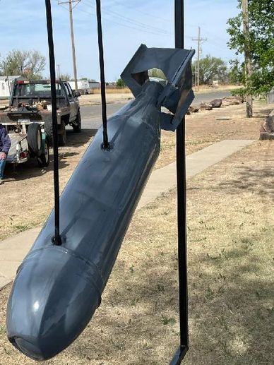 One of six practice bombs that was dropped on Boise City July 5, 1943. Jerry Shannon worked for the railroad and this bomb landed in sand pile near the tracks. Soft landing dented it, but it did not explode. This original bomb now has a permanent home at the Cimarron Heritage Center at 1300 North Cimarron in Boise City, Oklahoma.